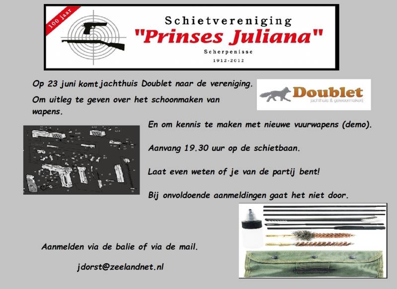 Op 23 juni komt Jachthuis Doublet naar de vereniging om uitleg te geven over het schoonmaken van wapens en ook om kennis te maken met nieuwe vuurwapens door middel van een demonstratie.